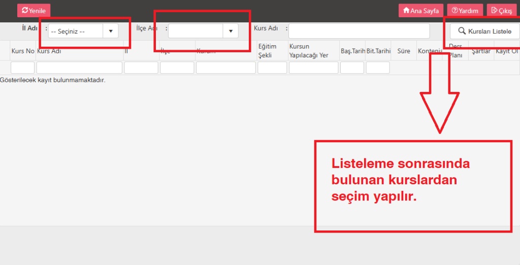 Kurs Seçimi Yapın: Listelenen kurslardan birini seçin.
